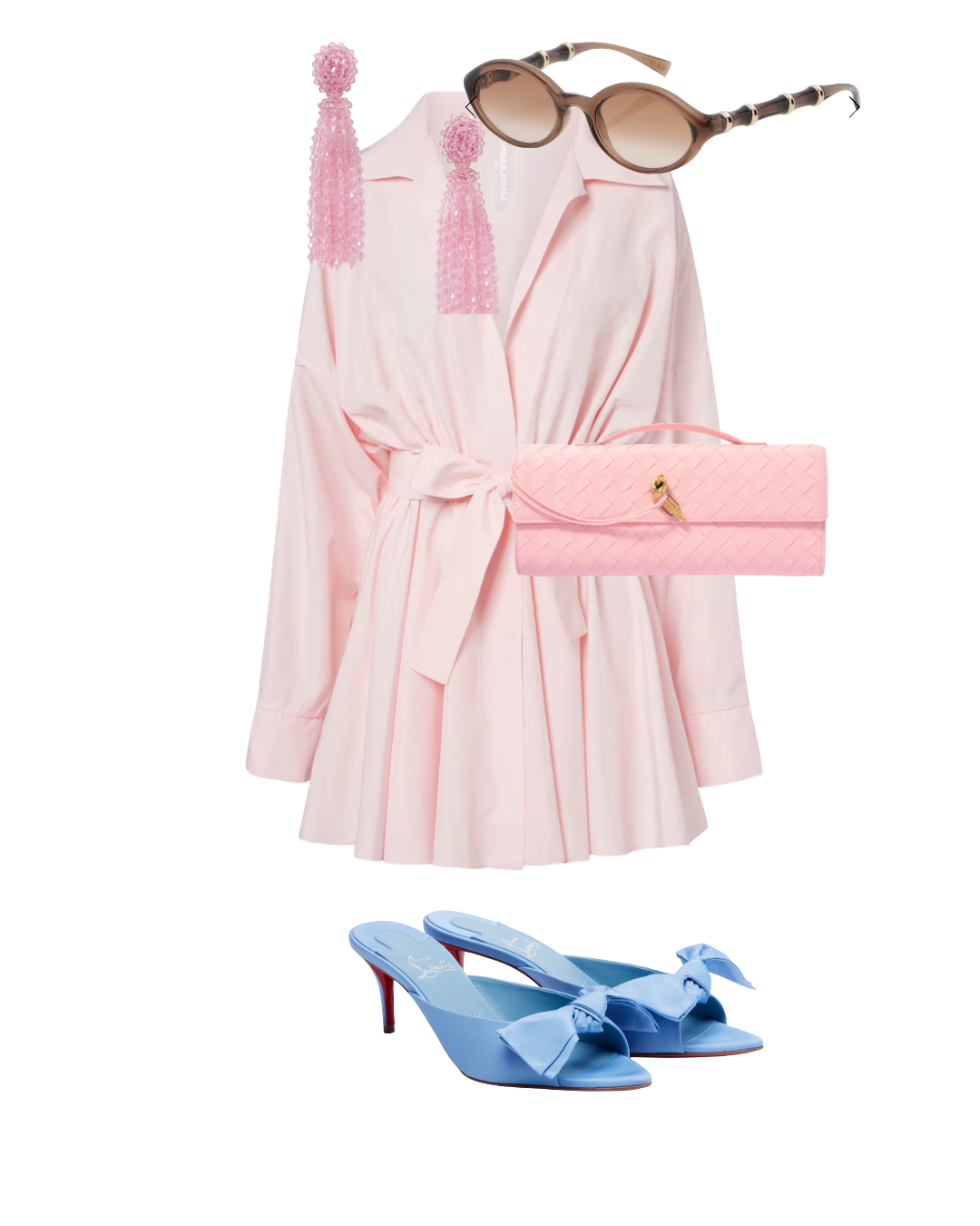 This look commits to a palette and arrives at something genuinely beautiful. The Mytheresa belted shirt dress in blush pink is the kind of piece that reads sophisticated rather than sweet — a structured shirt silhouette in a soft color, belted at the waist to give it definition and intention. It is feminine without trying too hard, and elegant without requiring anything elaborate.