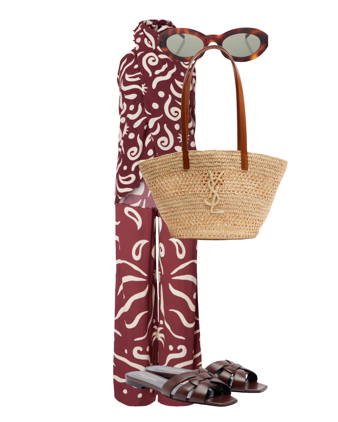 The YSL Panier raffia bag in natural straw is the outdoor accessory that grounds this look in the warmth of a spring afternoon — textured, relaxed, and beautifully proportioned against the wide sweep of the printed trousers. The YSL Tribute leather sandals in dark brown add a rich, earthy note that the burgundy in the print calls for. And the bamboo oval sunglasses — appearing across all three looks — are the common thread that ties this Mother's Day edit together.