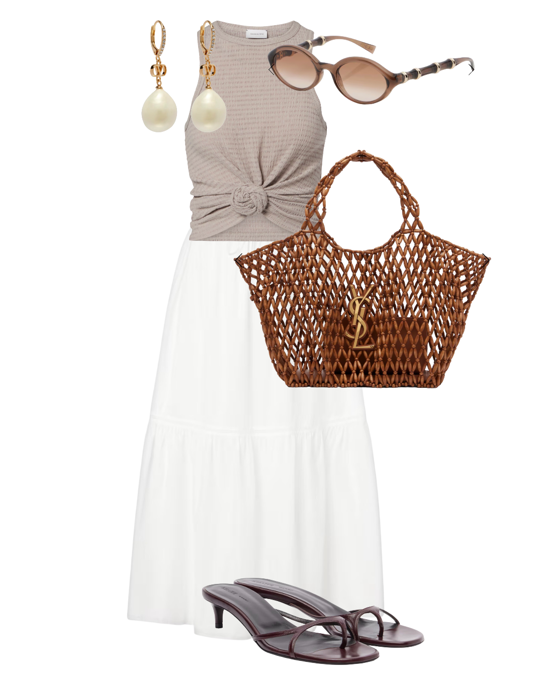 This is the look for the Sunday morning that deserves to feel like more than a Sunday morning. The knotted taupe ribbed top is one of those effortless pieces that manages to look considered without requiring any effort — the knot detail at the hem gives it shape and personality, the neutral taupe grounds the whole look without muddying it. Paired with the Venta white cotton midi skirt, the combination is clean, warm, and completely appropriate for everything from a garden table to a restaurant terrace.