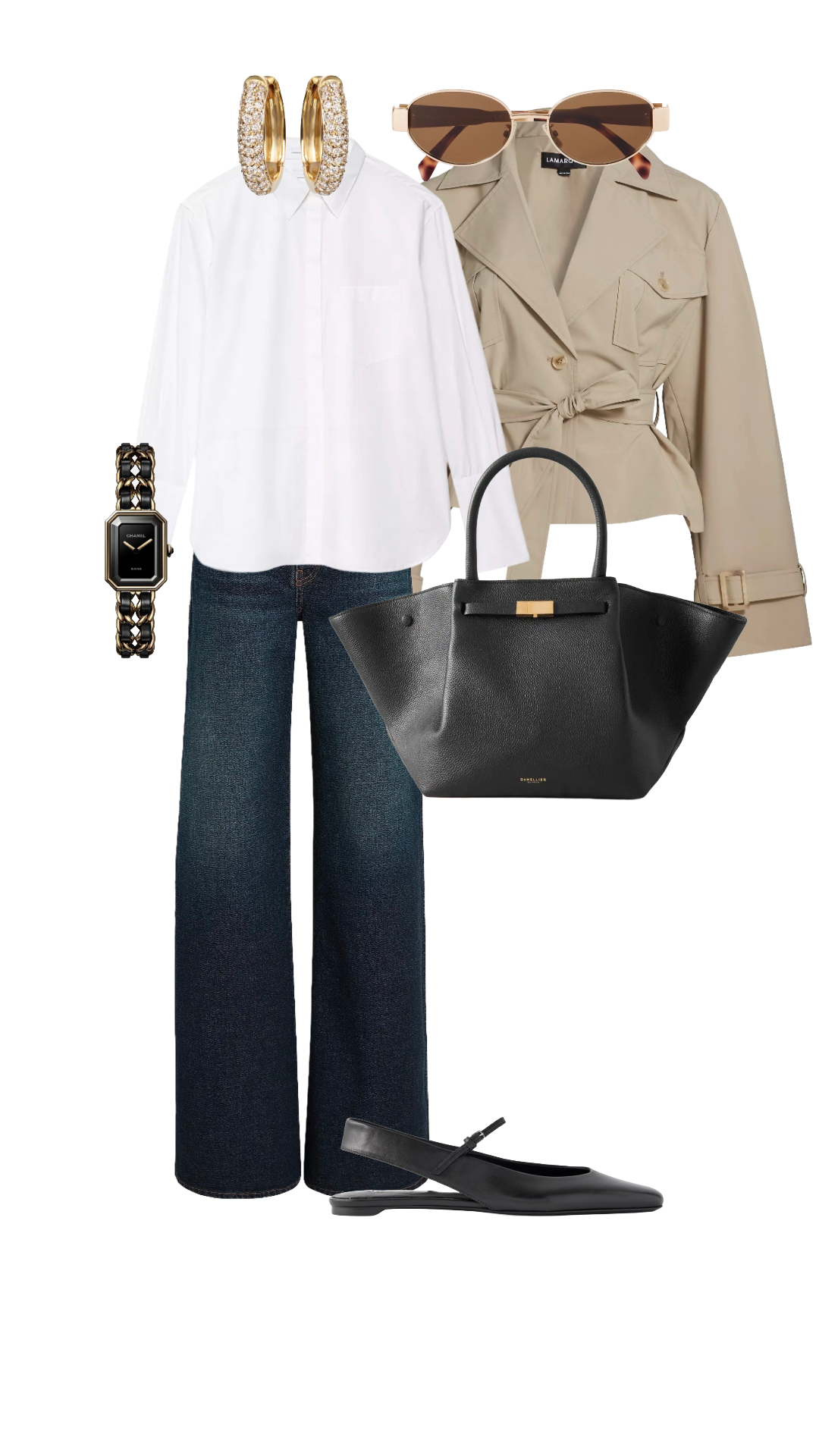 The Loewe Anagram cat-eye sunglasses with their tortoise frame and warm lens are the accessory that places this whole look in a specific, considered aesthetic — precise, fashion-aware, not trying too hard. The 14kt gold diamond hoop earrings shine delicately against the white shirt collar. And the Chanel Première watch on the wrist is the finishing detail that communicates, quietly and completely, that this person pays attention to things.