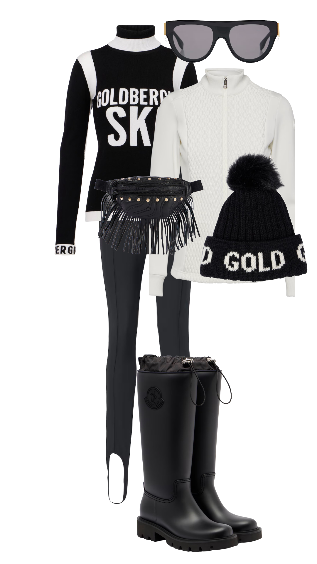 If Look 1 is a whisper, this look is a confident declaration. The Goldbergh Ski graphic turtleneck makes no apologies โ bold white lettering on a deep black base, with clean contrast panels at the collar and cuffs that read as intentional rather than loud. It's the kind of piece that skiers who actually know their brands will recognize immediately.