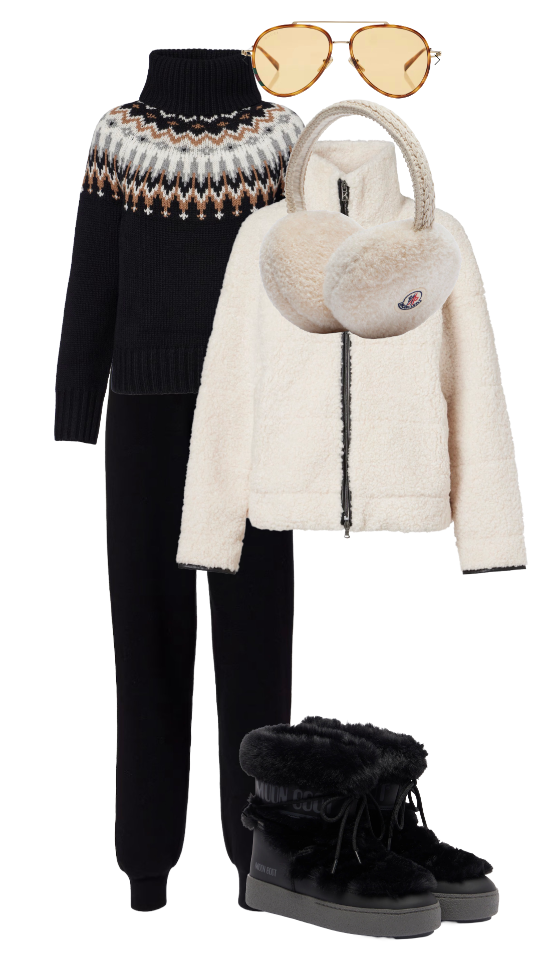 Here is the aprรจs-ski look that makes everyone in the lodge turn and look twice. The foundation is a black Fair Isle turtleneck โ that beautiful Nordic pattern across the yoke in cream, grey, and warm caramel โ one of those pieces that is simultaneously cozy and completely polished. Paired with wide-leg black knit pants, the whole silhouette reads effortless: a matching set you didn't have to try to coordinate.