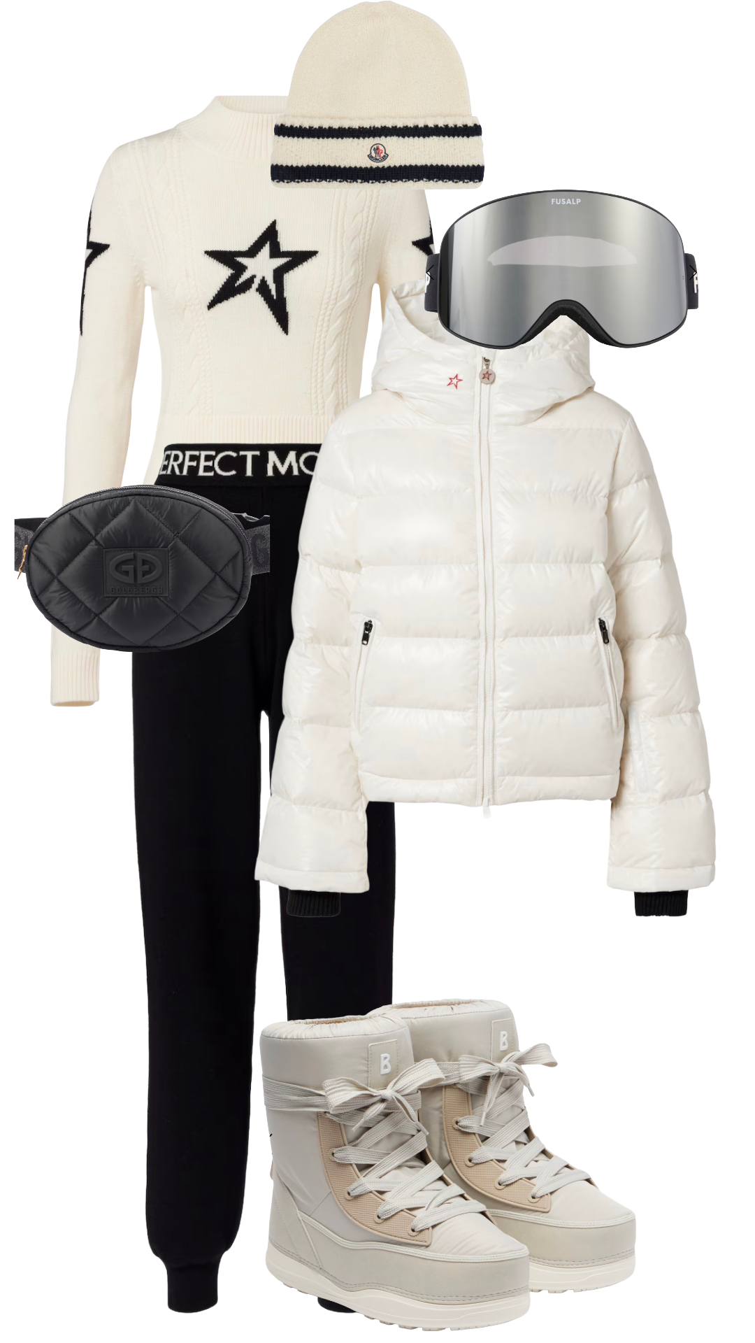 The accessories are where this look becomes truly considered. A Moncler cream beanie with navy stripe keeps the brand energy elevated without screaming for attention. Silver mirrored Fusalp goggles add an editorial edge. And the black quilted belt bag โ practical, polished, never fanny-pack-adjacent โ keeps your hands free without sacrificing style.